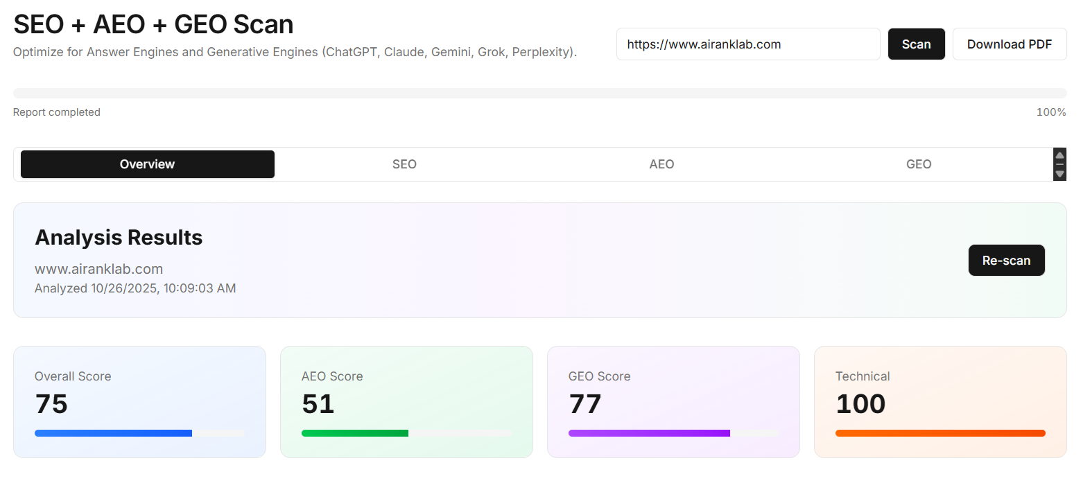Get instant insights across 100+ SEO, AEO, and GEO factors. Actionable recommendations in 60 seconds.
