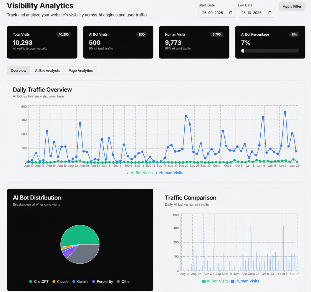 Track your website's visibility across major AI platforms including ChatGPT, Claude, Gemini, Grok, and Perplexity. Monitor traffic sources, analyze citations, and optimize your AI search strategy with detailed insights.